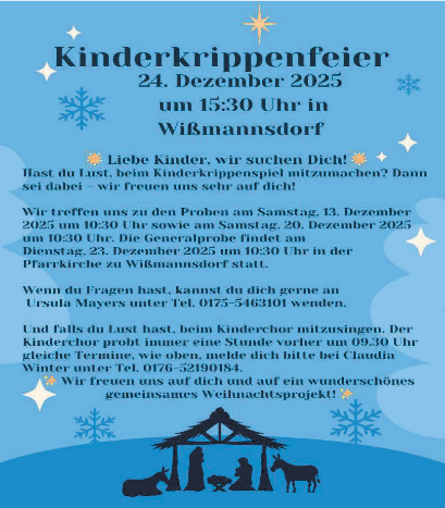 Wir treffen uns zu den Proben am Samstag, 13. Dezember 2025 um 10:30 Uhr sowie am Samstag, 20. Dezember 2025 um 10:30 Uhr. Die Generalprobe findet am Dienstag, 23. Dezember 2025 um 10:30 Uhr in der Pfarrkirche zu Wißmannsdorf statt.